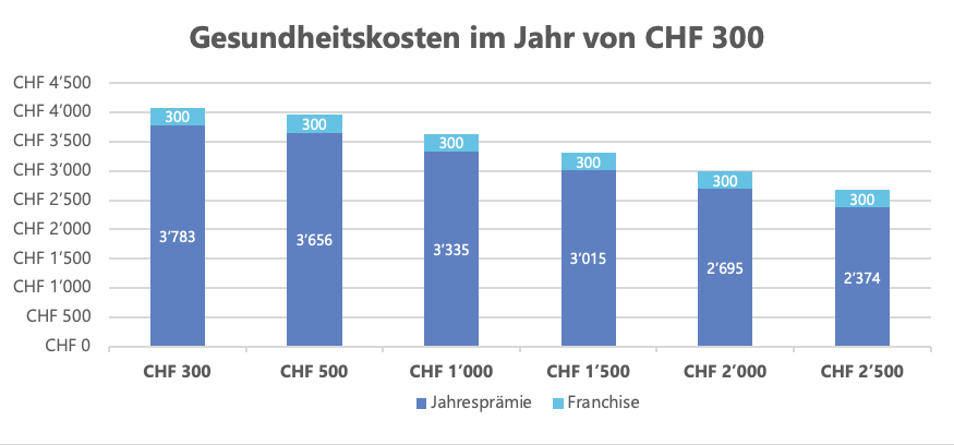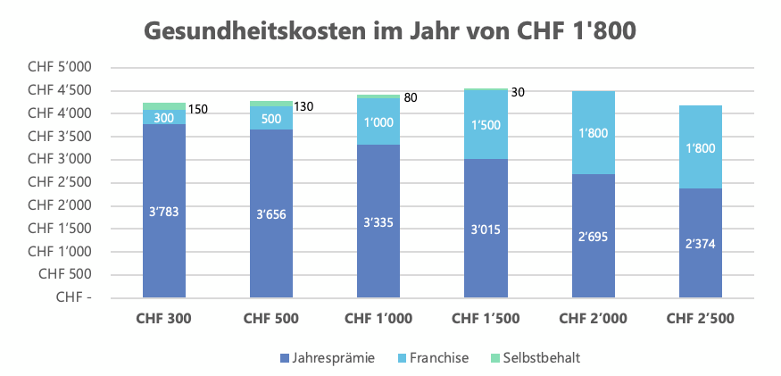Obwohl Du bei der Franchise zwischen sechs verschiedenen Beteiligungsstufen wählen kannst, sind finanziell gesehen nur zwei davon sinnvoll. Übersteigen Deine jährlichen Gesundheitskosten regelmässig den Schwellenwert von CHF 1‘800, so empfehlen wir eine Franchise von CHF 300 zu wählen. Übersteigen die Kosten nur selten diesen Grenzwert, so spart Du mit der höchsten Franchise von CHF 2’500 durchschnittlich über CHF 1‘400 Versicherungsprämien im Jahr.