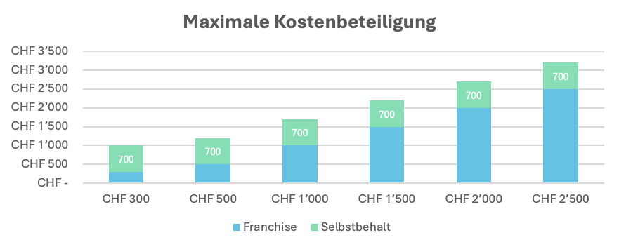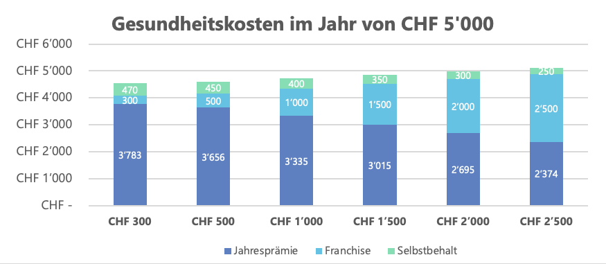 Eine Krankenkassenprämie solltest Du nie isoliert betrachtet. Wer selten einen Arzt konsultiert, kann mit der höchsten Franchisen-Stufe bares Geld sparen. So gilt grundsätzlich, je höher die Franchise, desto günstiger die monatliche Krankenkassenprämie (dunkelblauer Balken). Hinzu kommen die selbst zu bezahlenden Gesundheitskosten in Form der gewählten Jahresfranchise (hellblauer Balken) und einem allfälligen Selbstbehalt von 10% (grüner Balken). Der Selbstbehalt wird pro Fall verrechnet, sobald die Franchise aufgebraucht wurde.